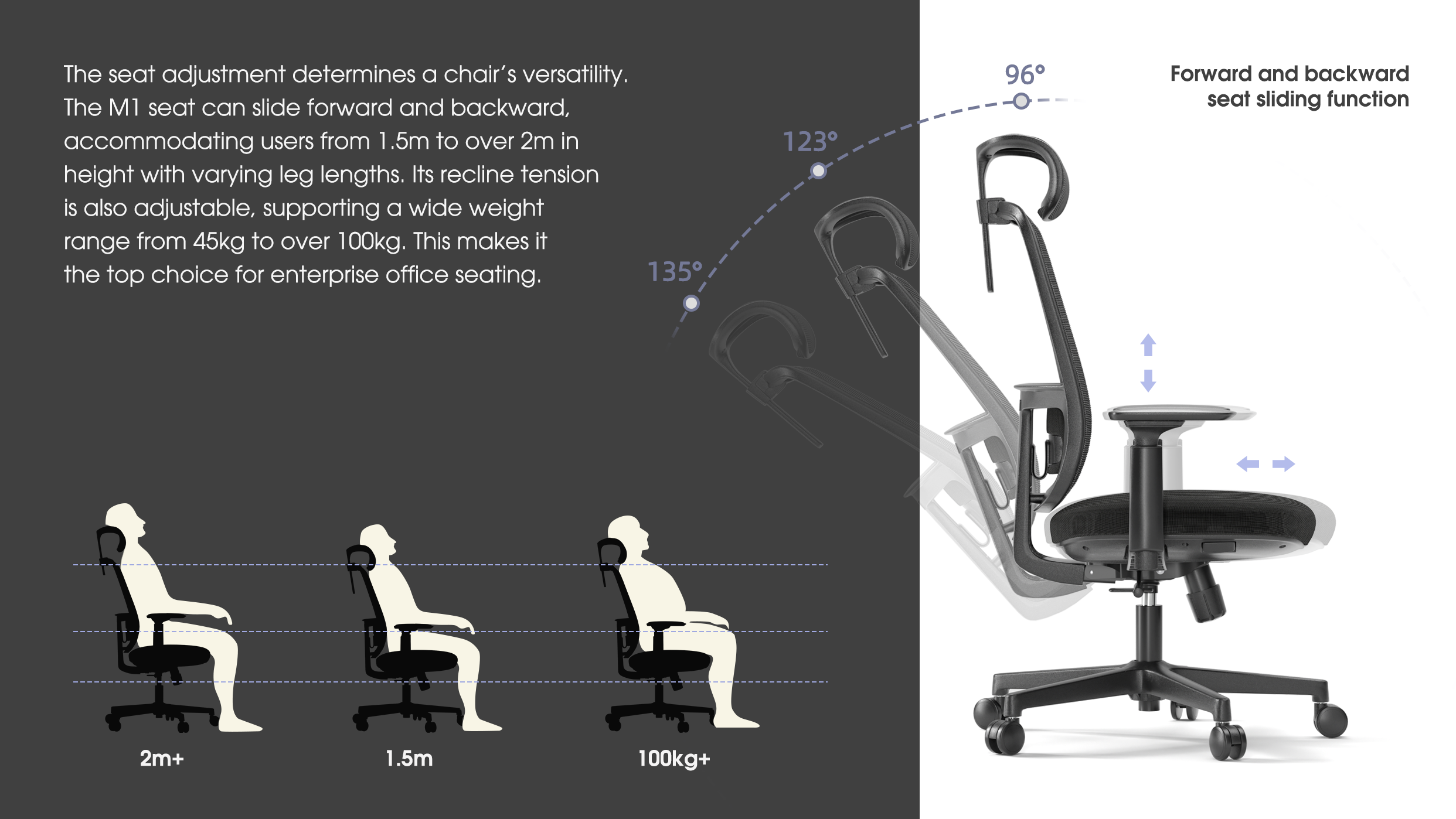 The M1 seat can slide forward and backward, accommodating users from 1.5m to over 2m in height with varying leg lengths. Its recline tension is also adjustable, supporting a wide weight range from 45kg to over 100kg. This makes it the top choice for enterprise office seating.